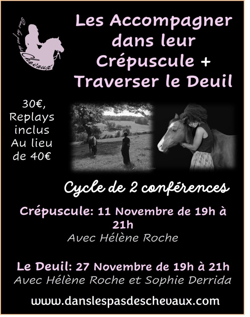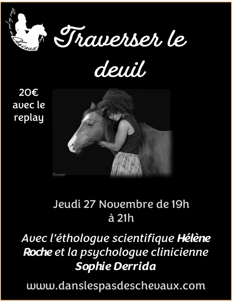 L’expérience d’accompagner son cheval en fin de vie amène fatalement à celle d’en traverser le deuil. C’est la raison pour laquelle, pour ce mois de Novembre j’offre la possibilité de s’inscrire à ces deux conférences et d’en accéder au replay au prix spécial de 30€ au lieu de 40€. Vous pourrez ainsi vivre ce cycle de conférence comme un cheminement.