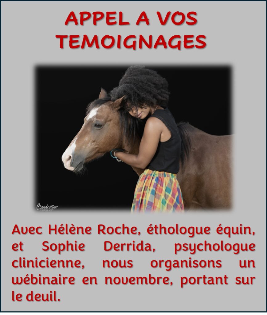 C’est la raison pour laquelle Hélène Roche, Sophie Derrida et moi avons organisé une campagne d’appel à témoignage à travers les réseaux sociaux au sujet de la traversée du deuil: Du deuil que nous traversons lorsque nous perdons notre compagnon équin, de l’observation des chevaux lorsqu’ils vivent le décès de leur congénère, mais aussi du retour d’expérience au sujet de chevaux qui ont vécu le décès de leur gardiens humain.